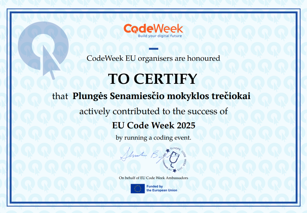 Spalio 11–24 dienomis mokykloje šurmuliavo ES programavimo savaitė (Code Week). Visos pradinės klasės leidosi į atradimų kupiną kelionę, kurioje mokėsi programuoti, tyrinėjo technologijų pasaulį ir patyrė, kad programavimas gali būti ir kūrybinis, ir labai smagus!
