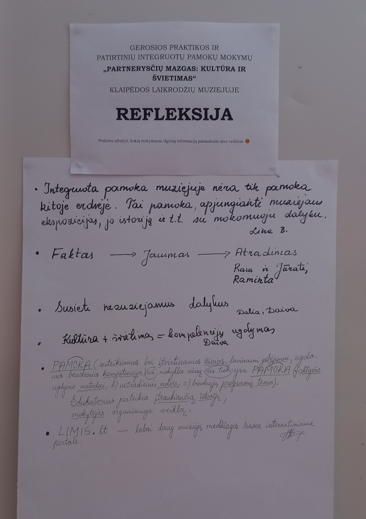 Pamokų refleksijos pavyzdys FAKTAS – JAUSMAS – ATRADIMAS visus sužavėjo savo paprastumu, taiklumu ir originalumu. Dar didesnį įspūdį paliko klaipėdiečių sukurta kultūros ir švietimo įstaigų bendradarbiavimo sistema. Malonu stebėti veiklas, kuriose edukatoriai pateikia įtraukiančias istorijas, o mokytojai organizuoja veiklą.