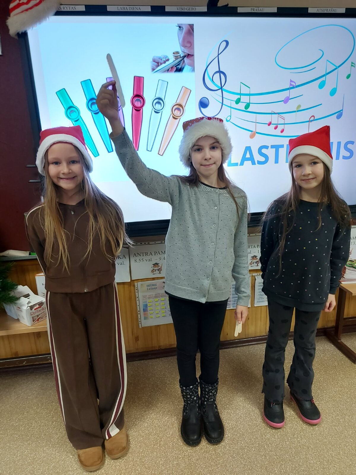 Gruodžio 5 d. 2c klasės mokinės Tėja, Lėja ir Gabija supažindino 2a klasės mokinukus su pasigamintu afroamerikietišku muzikos instrumentu kazu, kuris buvo naudojamas šimtus metų Afrikoje, užmaskuoti savo balsą ar pamėgdžioti gyvūnus.