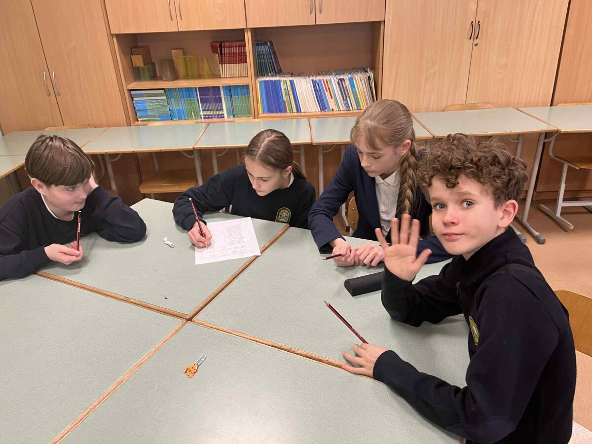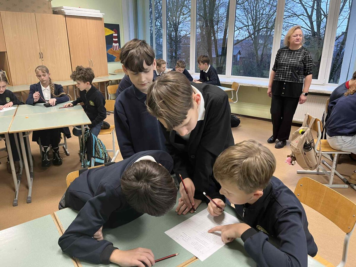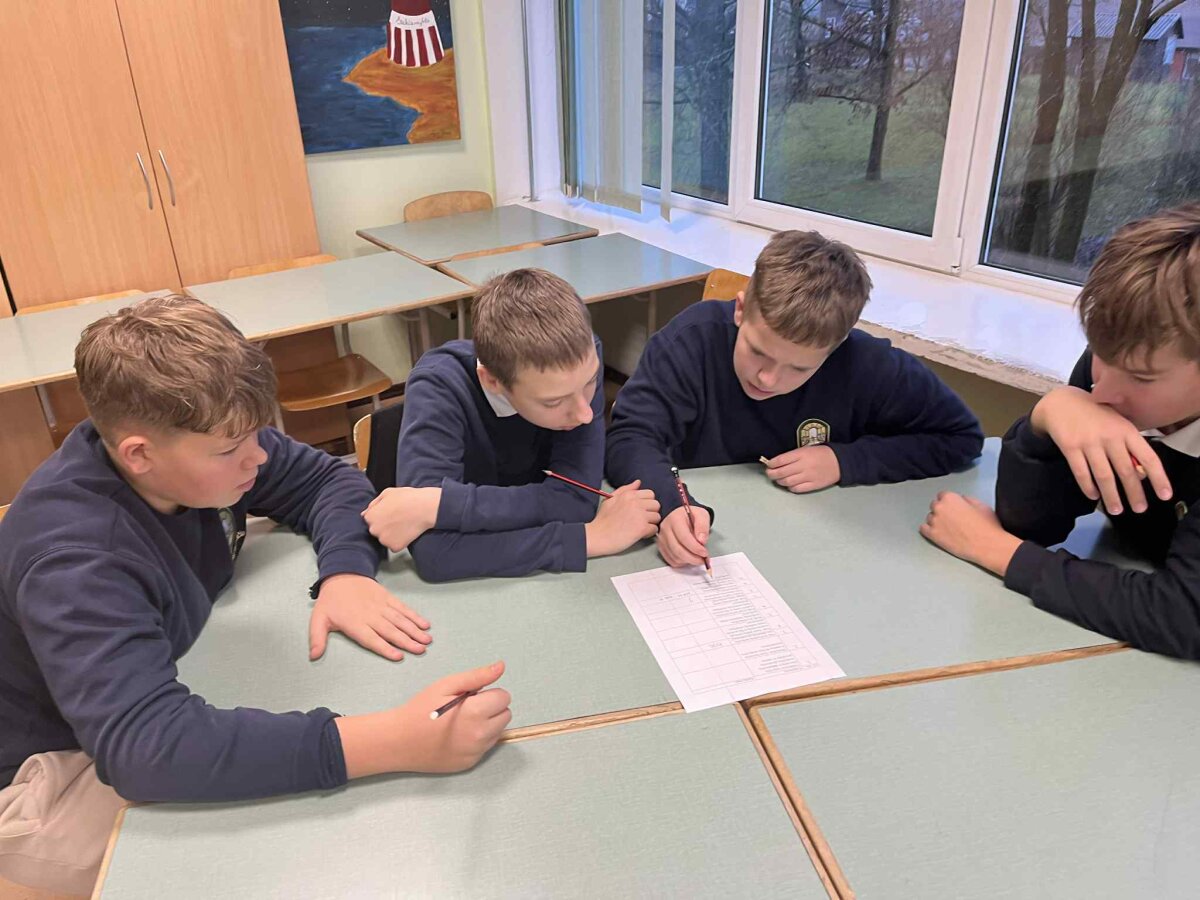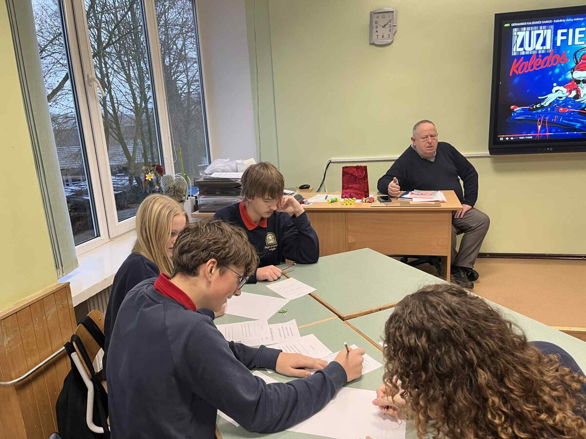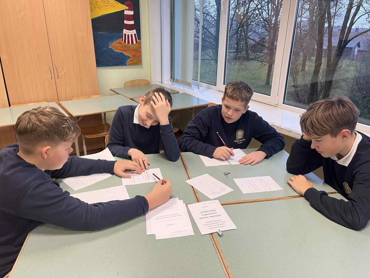 Keturios komandos, po keturis mokinius, sprendė matematinius kurso kartojimo uždavinius. Gautus rezultatus įrašę į atsakymų lentelę, komandų nariai turėjo įsiminti nemažai informacijos, susijusios su mūsų mokykla. Iš viso mokiniai išsprendė 40 matematikos uždavinių ir atsakė į 10 klausimų iš mokyklos istorijos.