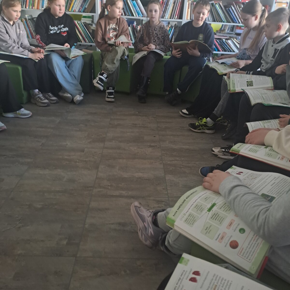 Antroji lietuvių kalbos pamoka persikėlė į mokyklos biblioteką. Čia trečiokai skaitė K. Kasparavičiaus kūrinėlius, atsakinėjo į klausimus, o vėliau bibliotekos fonduose ieškojo knygų, kuriose tyrinėjo kalbos dalis: daiktavardžius, būdvardžius ir veiksmažodžius.