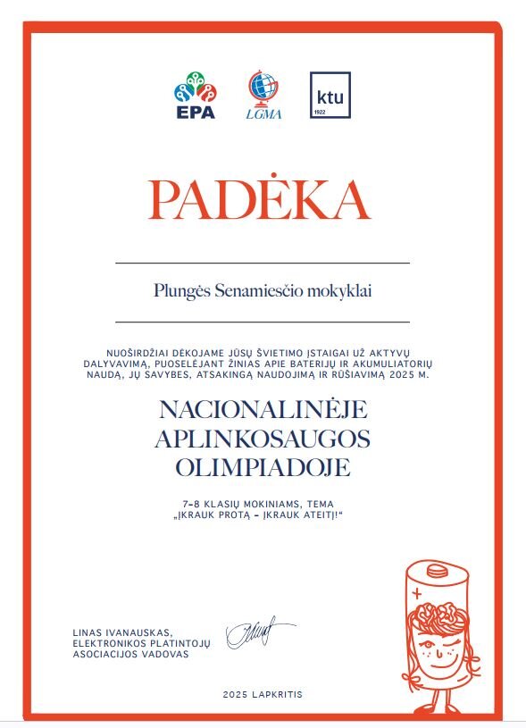 Mokykla gavo padėką už dalyvavimą olimpiadoje ir indėlį puoselėjant žinias apie baterijų ir akumuliatorių naudą, jų savybes, atsakingą naudojimą ir rūšiavimą.