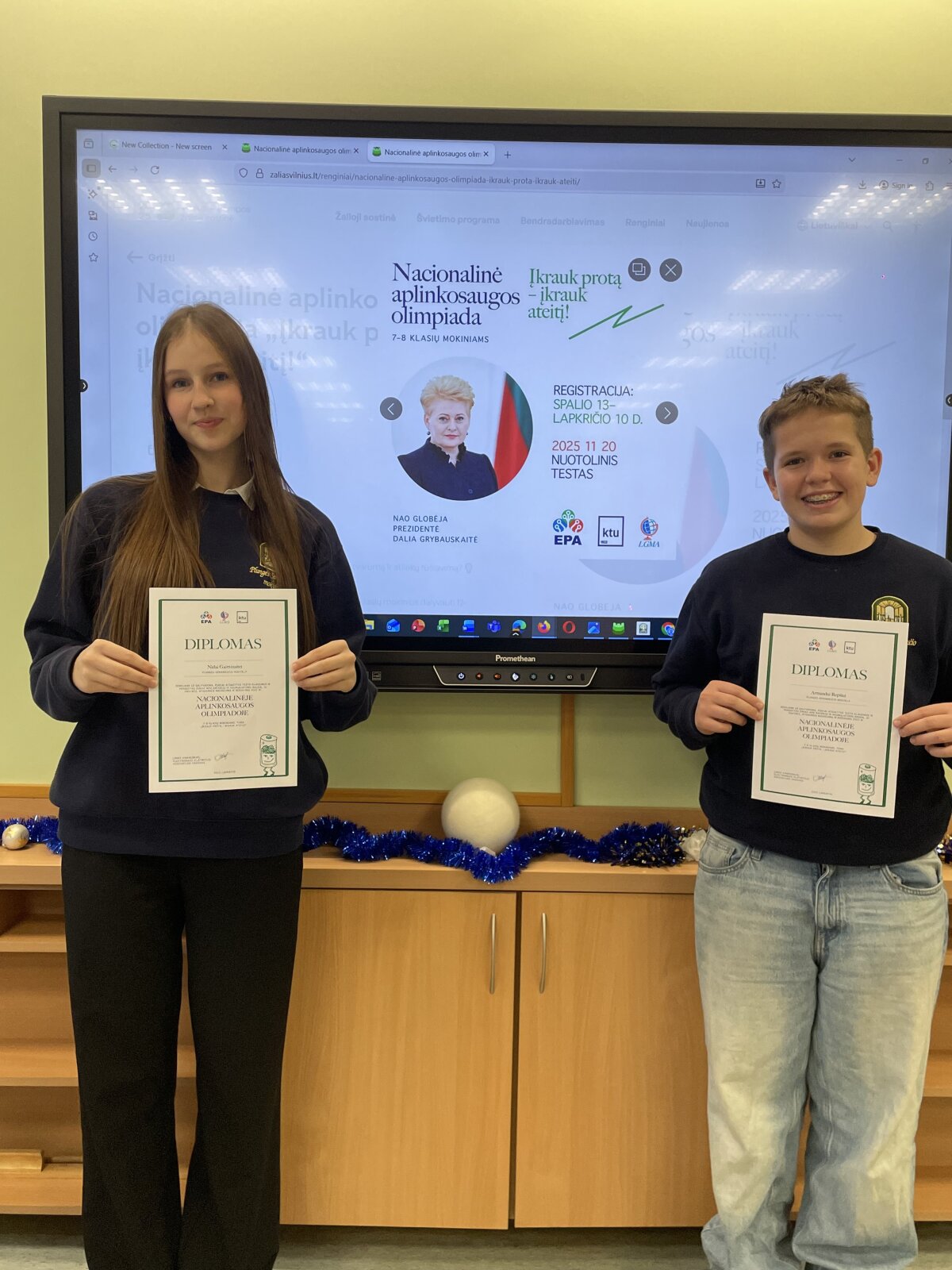 Puikiai sekėsi 7C klasės mokiniams Nidai Galminaitei ir Armandui Repšiui. Mokiniams įteikti diplomai.