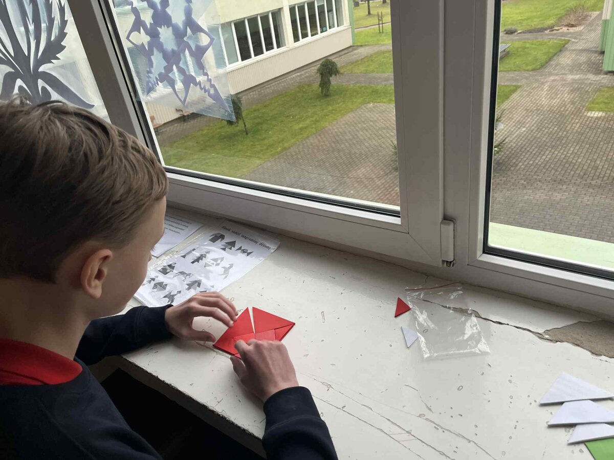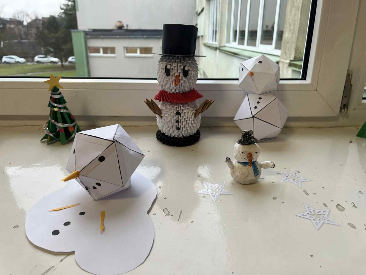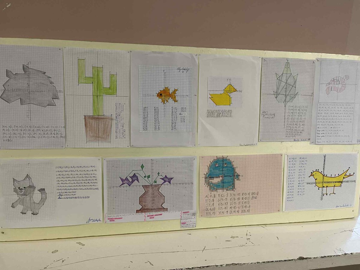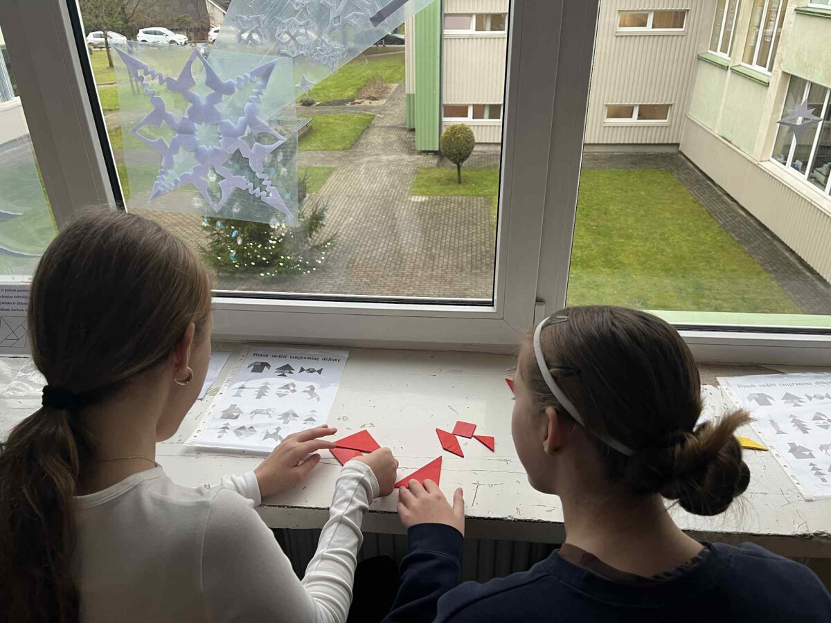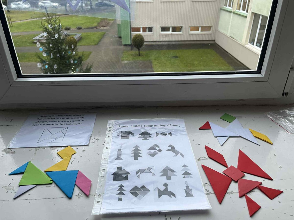 Baigiantis šiems kalendoriniams metams, matematikos mokytojos pasiūlė mokiniams kūrybiškai pasižiūrėti į geometrines plokštumos ir erdvės figūras. Tai, ką jose penktokai ir šeštokai įžvelgė visa mokyklos bendruomenė pamatė Žaidimų koridoriaus parodėlėje. Šeštokų piešiniuose koordinačių plokštumoje buvo galima rasti idėjų kalėdiniam atvirukui. Kūrybiškumo mokėsi senamiestukai ir pertraukų metu, bandydami sudėlioti kalėdinę tangramą.